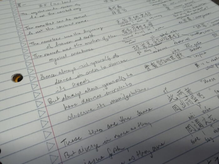 Perhaps it’s because I grew up in an age where writing on paper was just the done thing, but I find it most intuitive to write things down on paper despite having a tremendous affection for my iPad and Apple Pencil. When I am working with translation and poetry analysis, as you see above, I find it easiest to write out the original and the translation. In the above, I was working with D.C. Lau’s translation of the first chapter of the Daodejing, which I used as an excuse to learn a few new hanzi and a tiny portion of literary Chinese. I find the Daodejing easier to understand as a work of philosophy by examining the source text and the translation simultaneously because in Classical Chinese, the rhetorical style is extremely restrained by Western standards and as such, many texts admit multiple possible interpretations in quantum superposition.